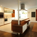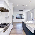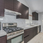 Photo of a mid-sized contemporary u-shaped eat-in kitchen in Denver with an undermount sink, flat-panel cabinets, brown cabinets, marble benchtops, white splashback, marble splashback, stainless steel appliances, with island, brown floor and medium hardwood floors. — Houzz