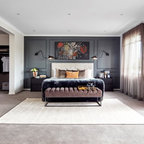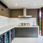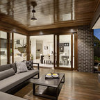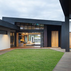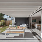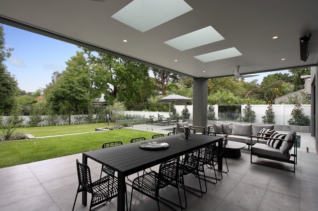 Large contemporary backyard patio in Sydney with natural stone pavers and a roof extension. — Houzz