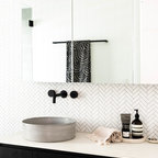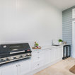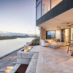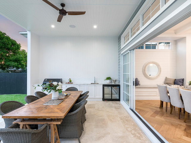 Transitional backyard patio in Brisbane with an outdoor kitchen, tile and a roof extension. — Houzz