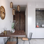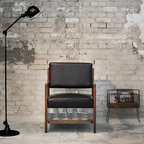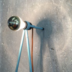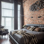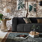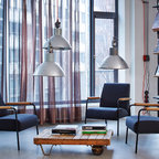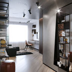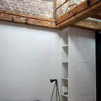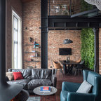 This is an example of a mid-sized industrial formal loft-style living room in Frankfurt with white walls, laminate floors, no fireplace, a freestanding tv and beige floor. — Houzz