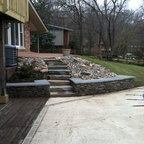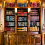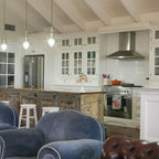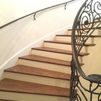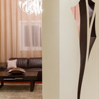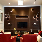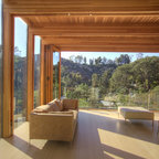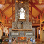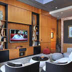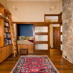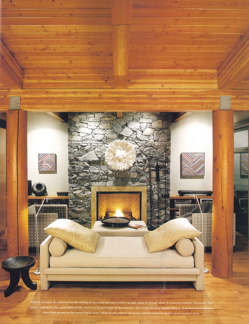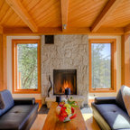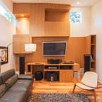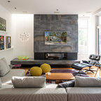 This is an example of a mid-sized contemporary open concept family room in Vancouver with white walls, medium hardwood floors, a standard fireplace, a stone fireplace surround, no tv and brown floor. — Houzz