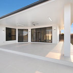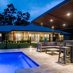 Photo of a large contemporary backyard patio in Melbourne with an outdoor kitchen and concrete pavers. — Houzz