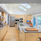 Photo of a contemporary open plan kitchen in Phoenix with porcelain floors, flat-panel cabinets, light wood cabinets, stainless steel appliances and with island. — Houzz