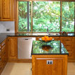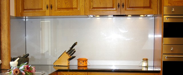 Glass Splashbacks on this Solid Timber Kitchen of American Oak with Black Galaxy Granite Benchtops by Adelaide's Compass Kitchens.