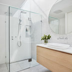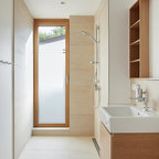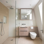 Design ideas for a large contemporary master bathroom in Gothenburg with flat-panel cabinets, light wood cabinets, an alcove shower, a one-piece toilet, porcelain tile, white walls, limestone floors, a drop-in sink, white tile, grey floor and an open shower. — Houzz