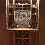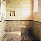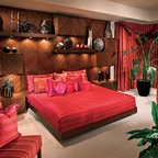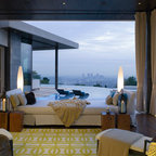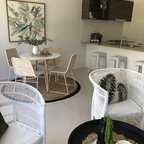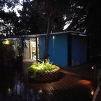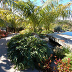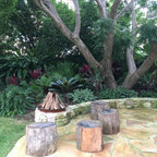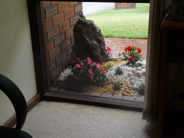 Using different sized and different coloured pebbles, pretty flowers and an upright rock to link the wall to the ground creates interest in this window garden set between the blandness of the carpet and pavers and the freshness of the grass.