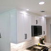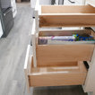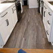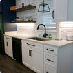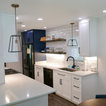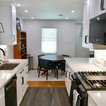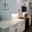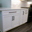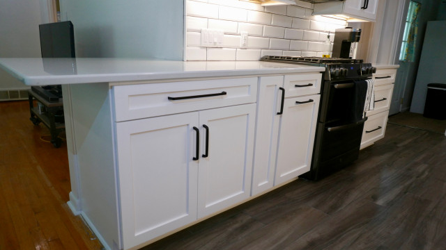 New Kith Kitchen cabinets with Shaker style doors and drawers. 42" tall wall cabinets in the color of Bright White. Top Knobs cabinet hardware/pulls. Moved the washing machine from the kitchen into the laundry room, which produced much more countertop area for this side of the kitchen. Installed Vicostone Gioia Carrera Quartz countertop with beveled edge. MIlestone MoodWood 8" x 48" porcelain wood plank floor tile in the color of Nut and Bostik Vivid grout in the color of French Grey!!