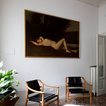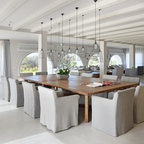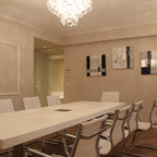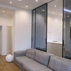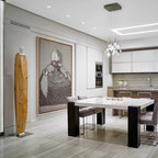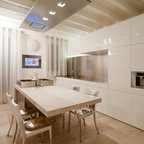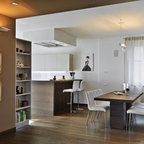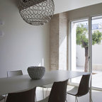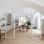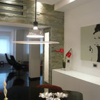 Design ideas for a contemporary separate dining room in Milan with light hardwood floors, no fireplace, multi-coloured floor and white walls. — Houzz