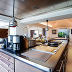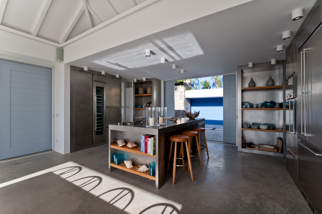 Design ideas for a contemporary kitchen in Other with open cabinets and stainless steel appliances. — Houzz