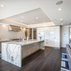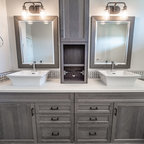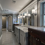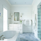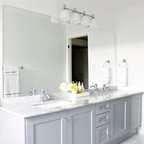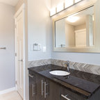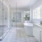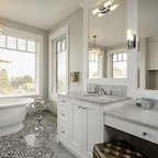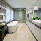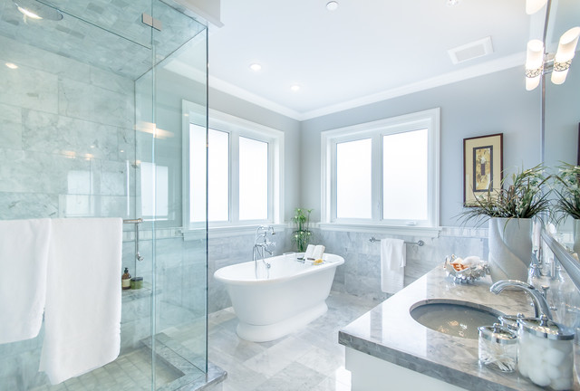 Transitional master bathroom in Vancouver with an undermount sink, a freestanding tub, gray tile and grey walls. — Houzz