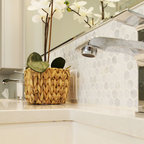 Like the color scheme, light gray and white to keep it bright plus a hint of blue. Like use of stone.