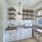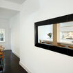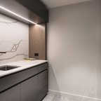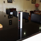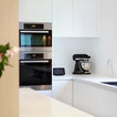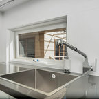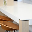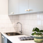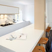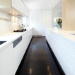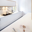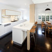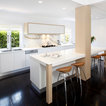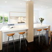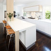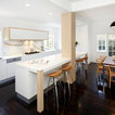 This modern kitchen space was converted from a separate kitchen, laundry and dining room into one open-plan area, and the lowered ceiling in the kitchen helps define the space.
