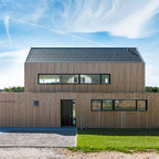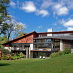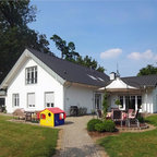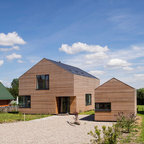 Country two-storey multi-coloured house exterior in Other with mixed siding and a gable roof. — Houzz