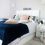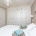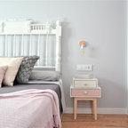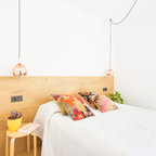This is an example of a mid-sized scandinavian master bedroom in Other with white walls, light hardwood floors, no fireplace and beige floor. — Houzz