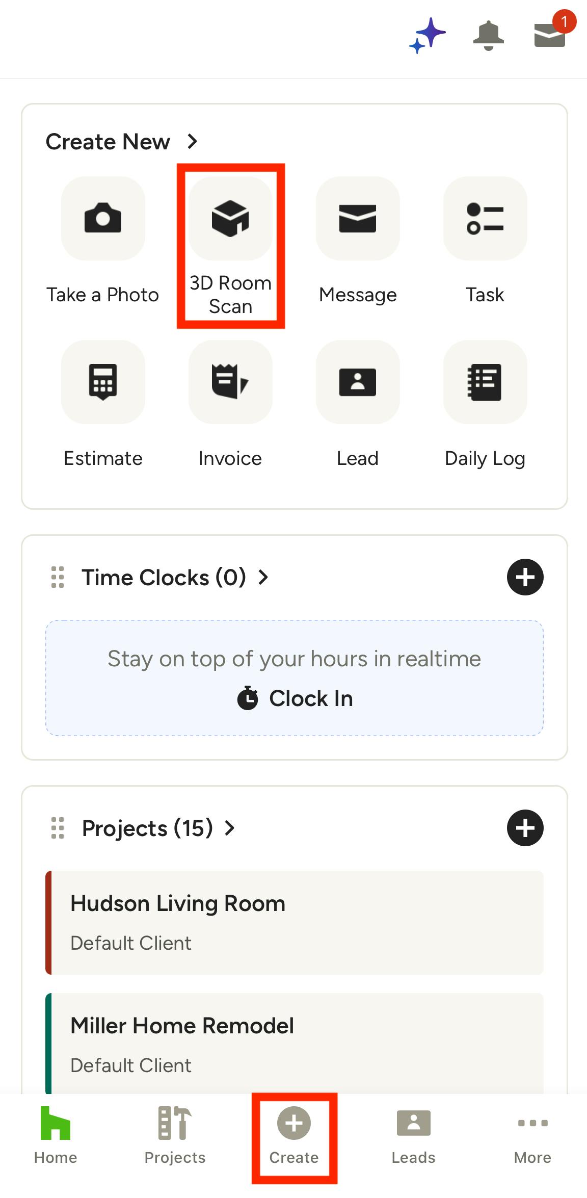 To create a new 3D floor plan using the 3D Room Scanner, open up the Houzz Pro app. From the homepage, you can either: