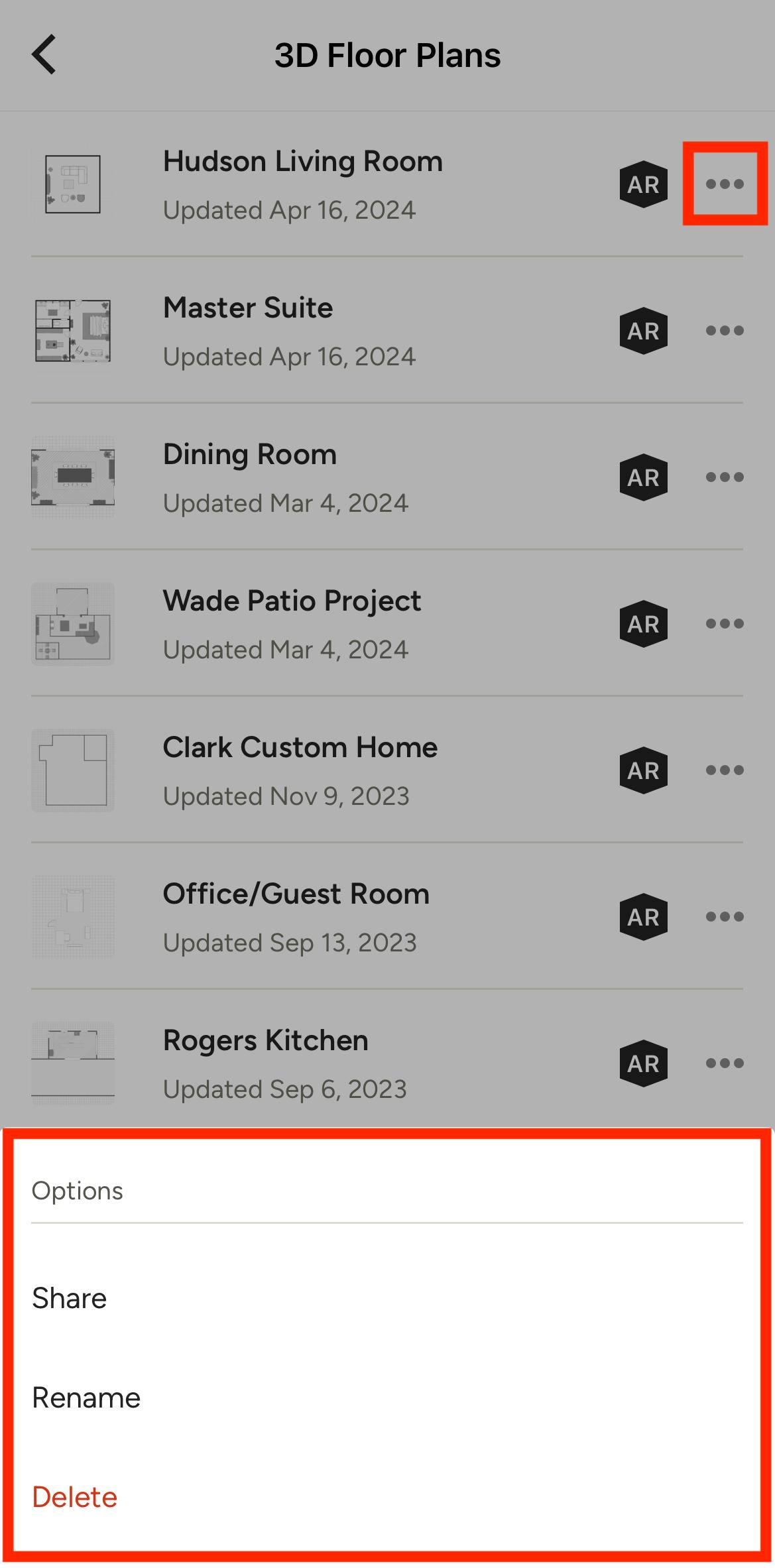 From your 3D Floor Plan list, you can also click the three dots icon on the right of your plan to Share, Rename or Delete.