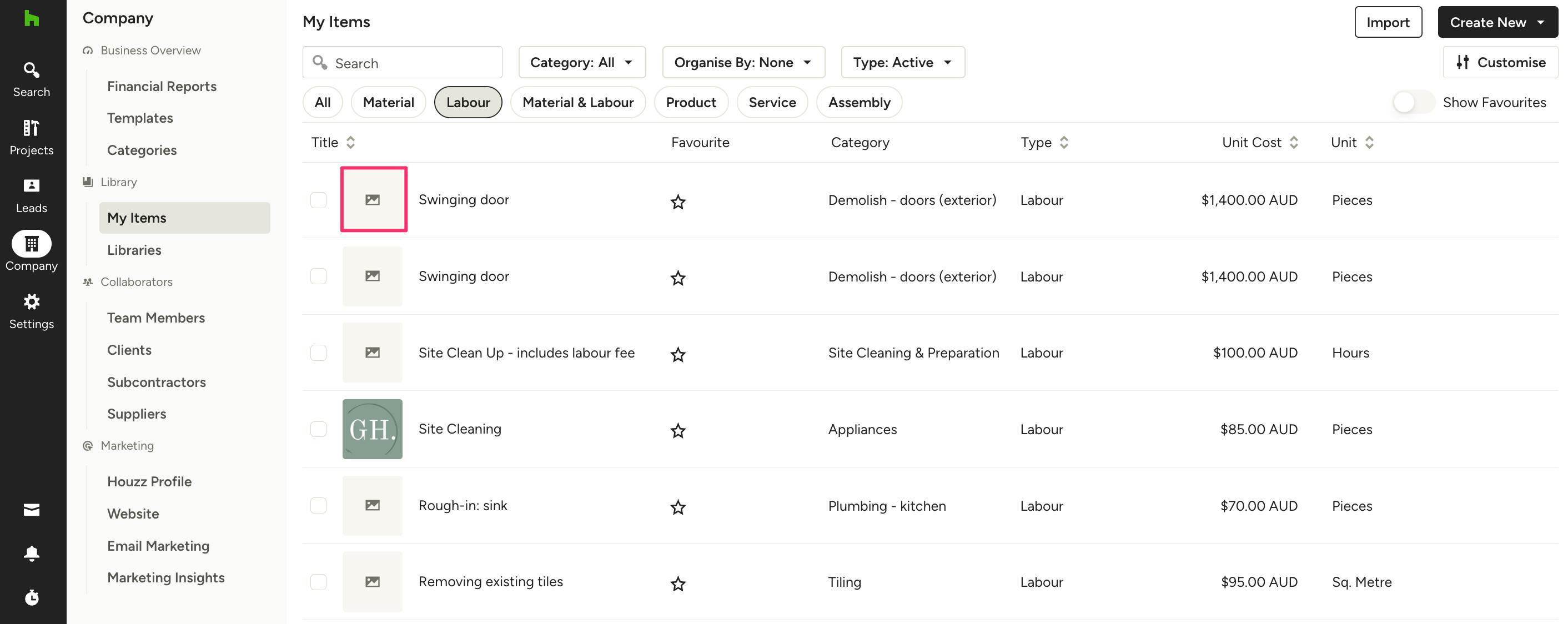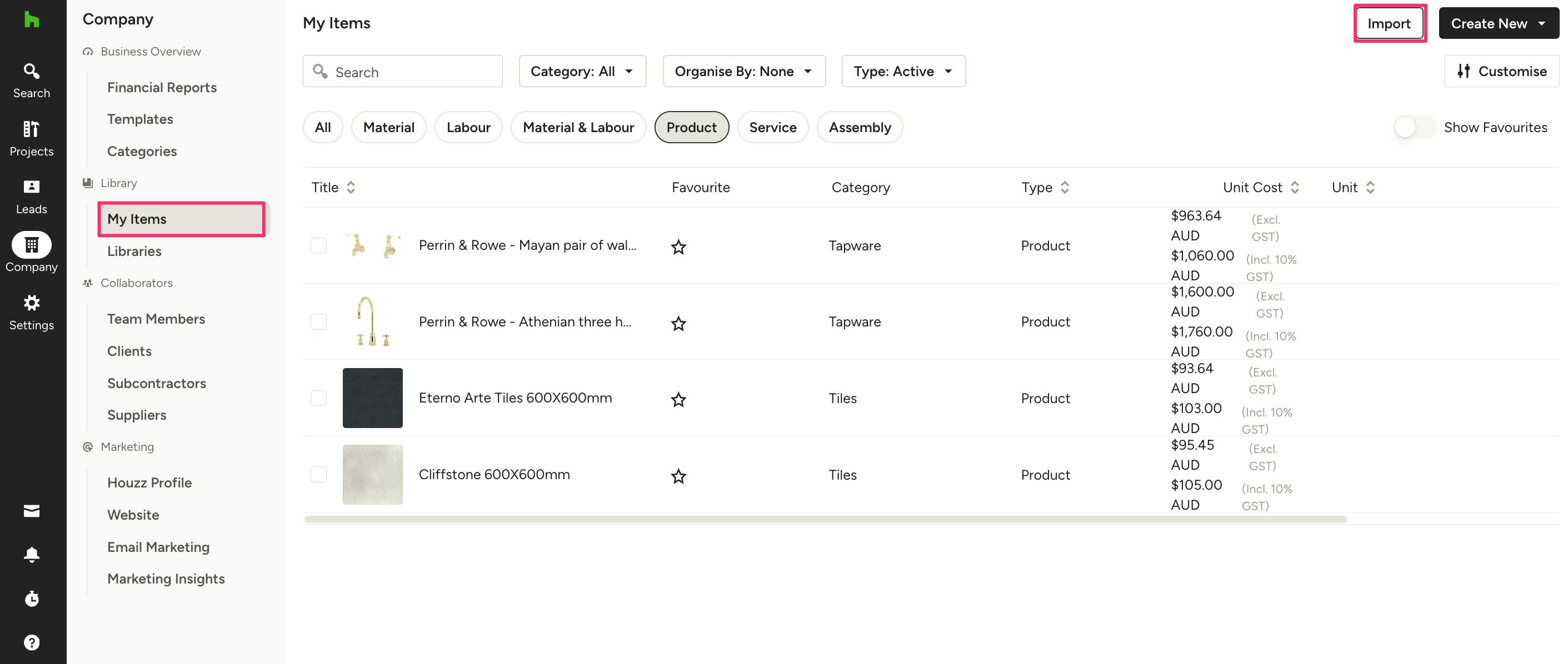Easily import your own library of items directly into Houzz Pro to save time when creating estimates/proposals, invoices, and more. In just a few minutes you can import hundreds of line items and save them in your library for future use.