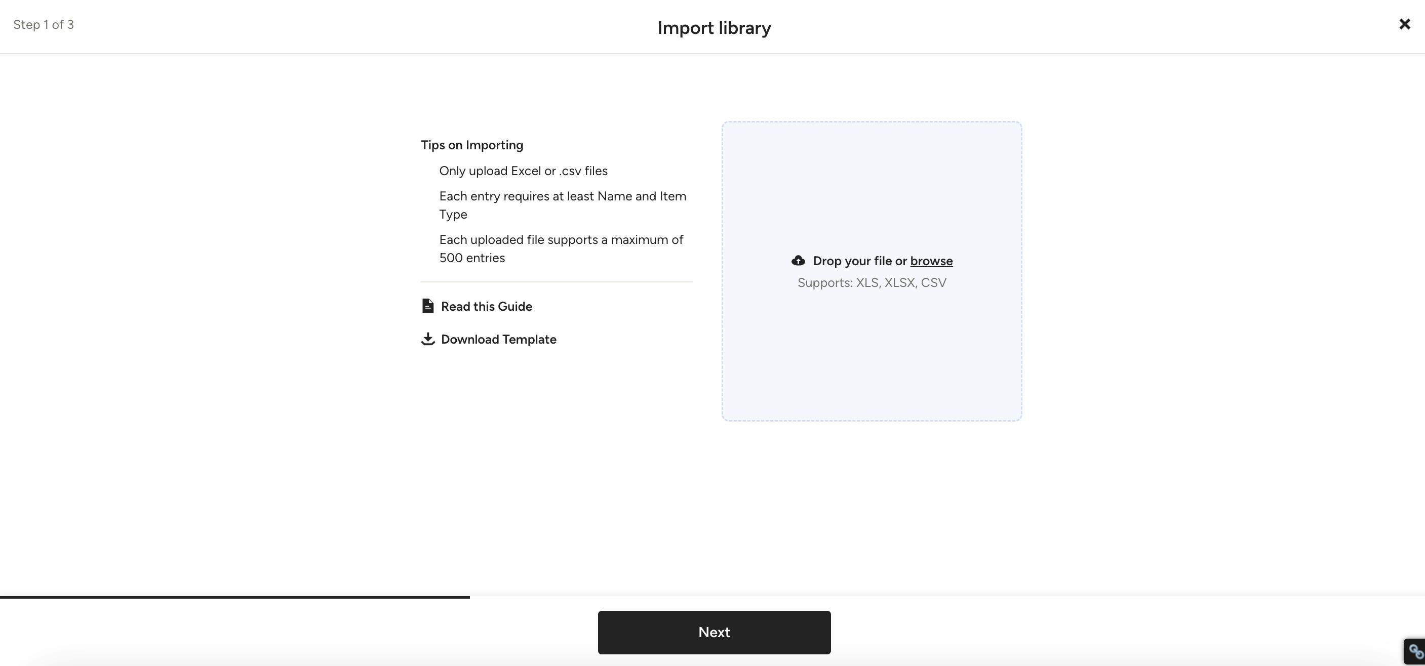 1. Open the My Items page, which can be found under the Library section of the Company menu in the left navigation. Click the Import button in the top right.