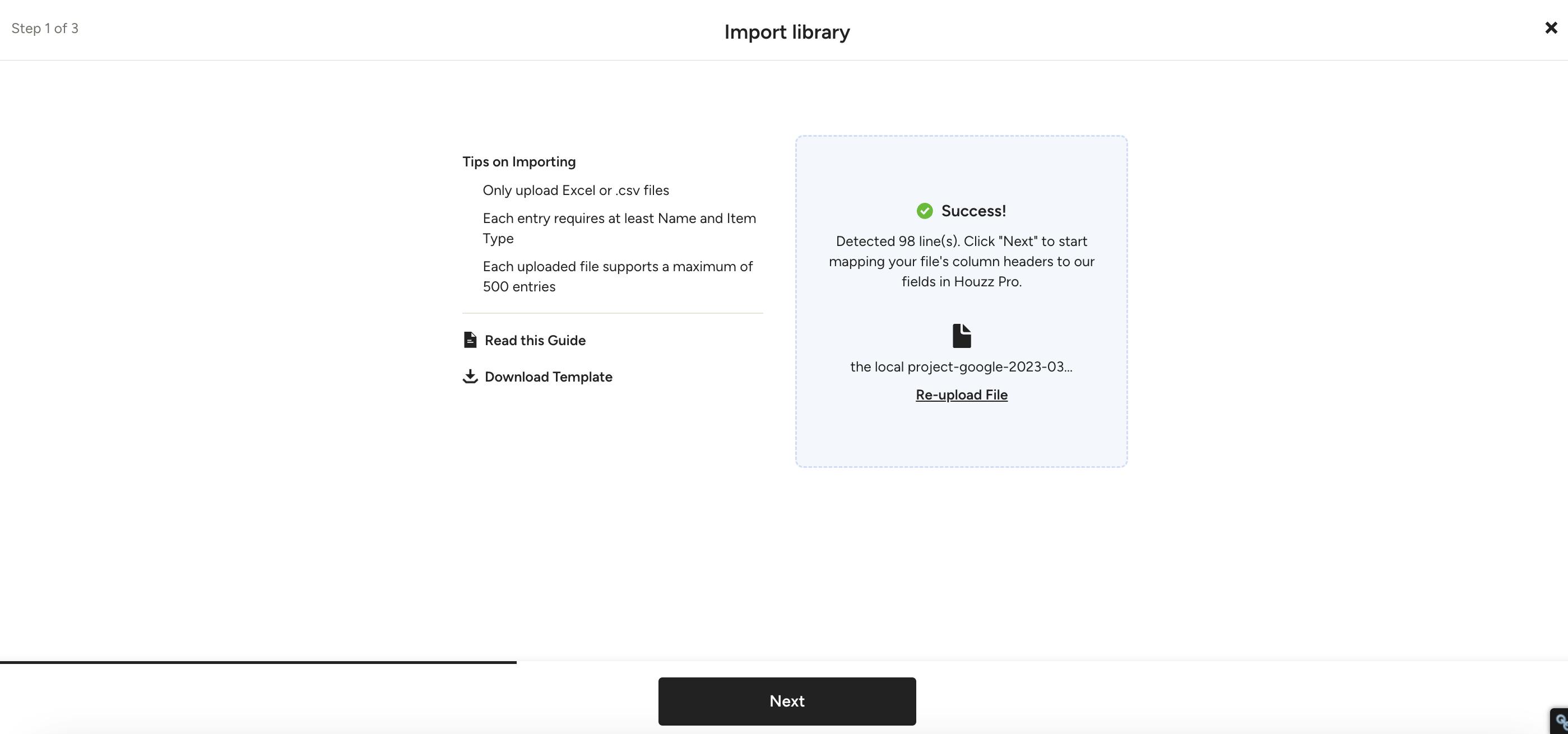 - The file you tried to upload has already been imported - if you wish to duplicate the library in Houzz Pro, upload the file again. Otherwise, choose a new file to upload.